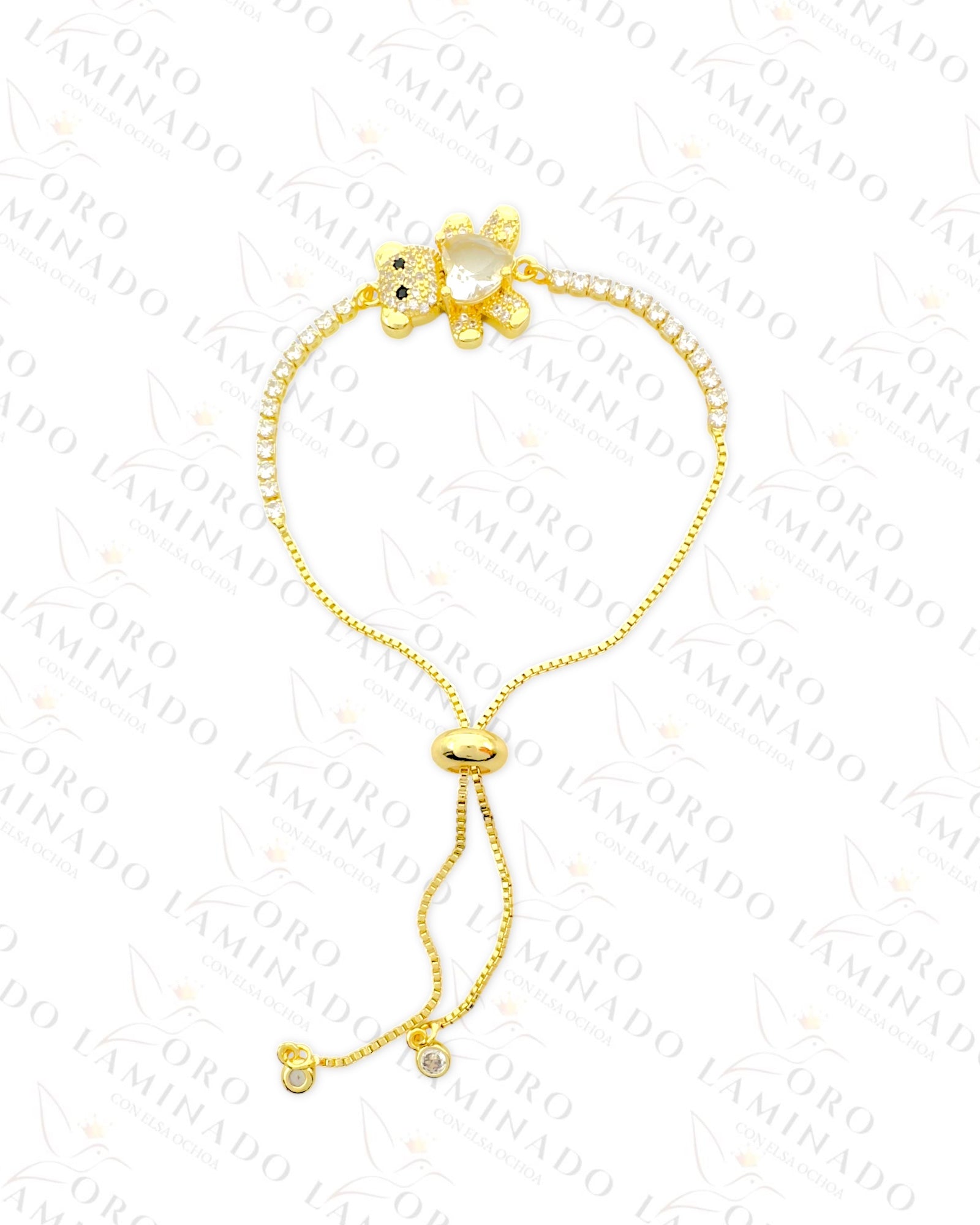 Beautiful Teddy Bear Adjustable Bracelet Covered in Delicate Clear Stones and with a Crystal Heart for a Fancy and Casual Look. Gold Color, 14K Gold Filled