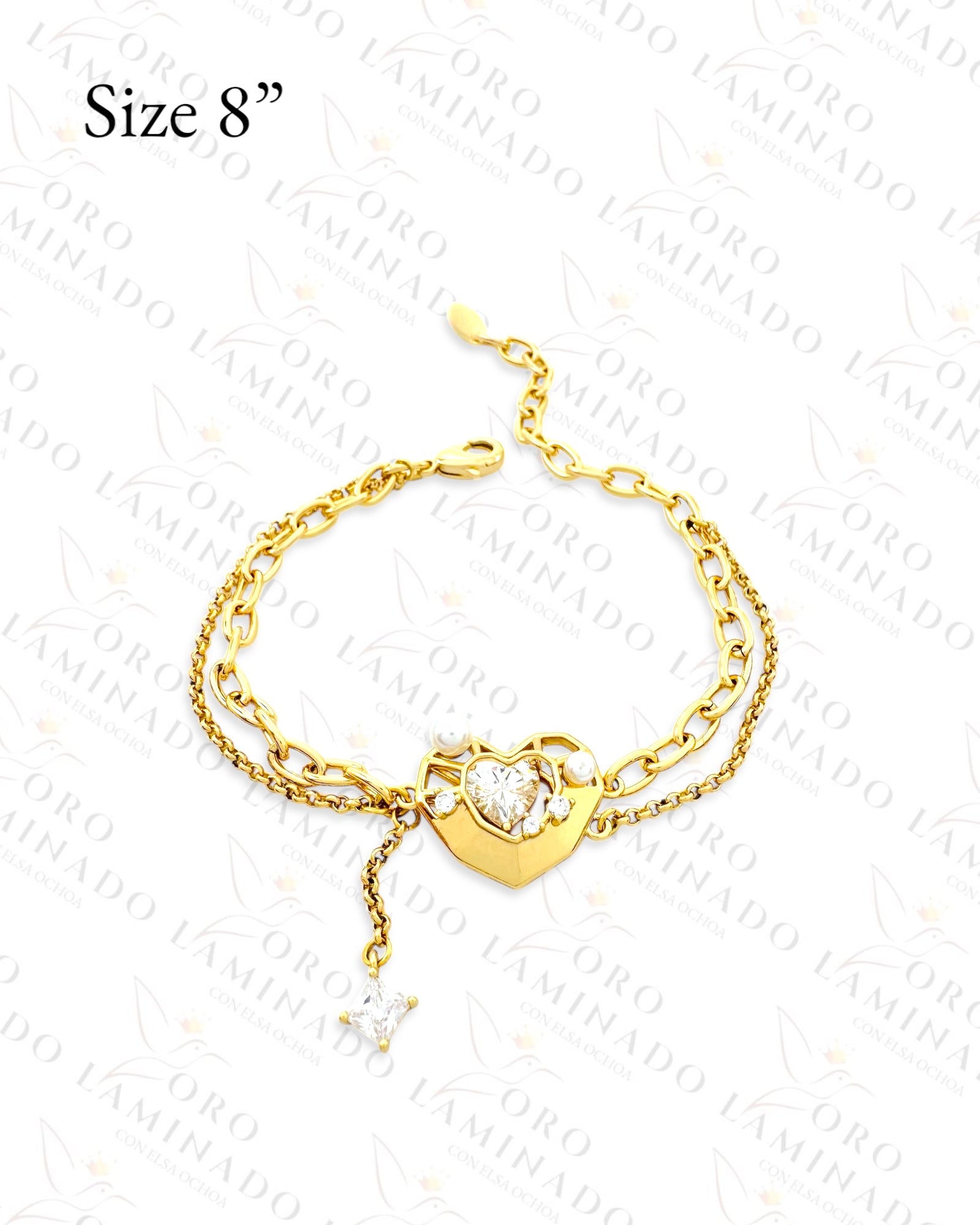 Beautiful High Quality Double Chain Bracelet with Crystal Heart at the Center and Embellished by Delicate Pearls for a Unique and Elegant Design. Adjustable to a Smaller Size. Gold Color, 14k Gold Filled.